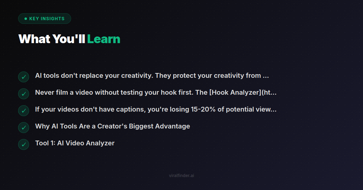 The gap between creators who grow and those who stagnate isn't talent. It's tools. Every creator on this list is free. Every workflow improvement is measurable. Stop guessing and start analyzing. Your first step: paste your latest video into the Viral Finder Video Analyzer and see where you stand.