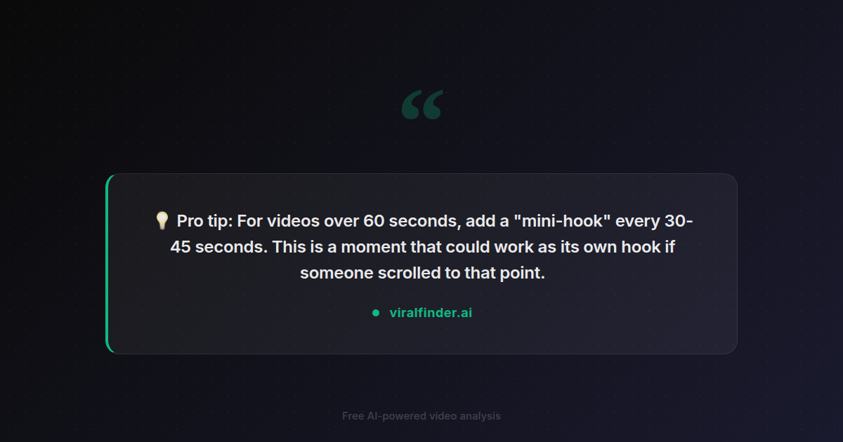 💡 Pro tip: For videos over 60 seconds, add a "mini-hook" every 30-45 seconds. This is a moment that could work as its own hook if someone scrolled to that point.